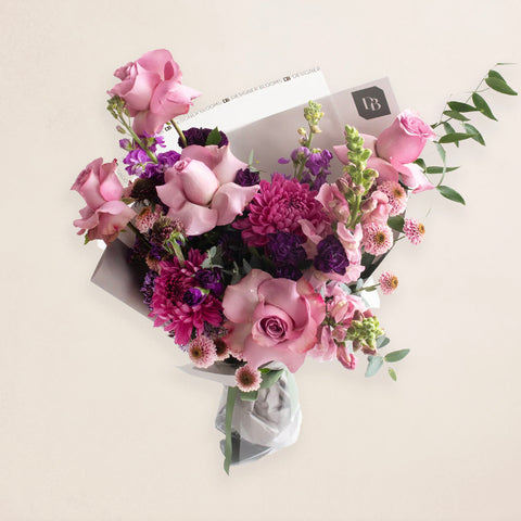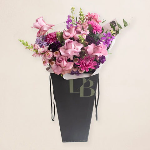Immerse yourself in the vibrant allure of the Chennai Bouquet, a luscious mix of modern and traditional fresh flowers. This bouquet is a stunning blend of Roses, Lisianthus, Snapdragons, Statice, Mums and Eryngium, each flower lending its unique charm to create a breathtaking ensemble. The bouquet boasts rich berry tones, with the roses providing a classic touch, the lisianthus and snapdragons adding a hint of whimsy, and the statice, mums, and eryngium offering a delightful burst of color and texture