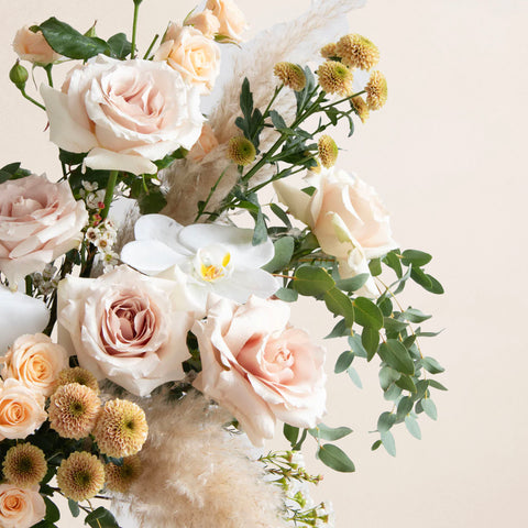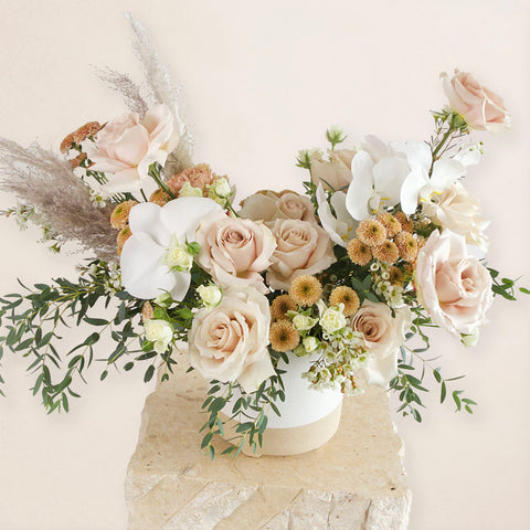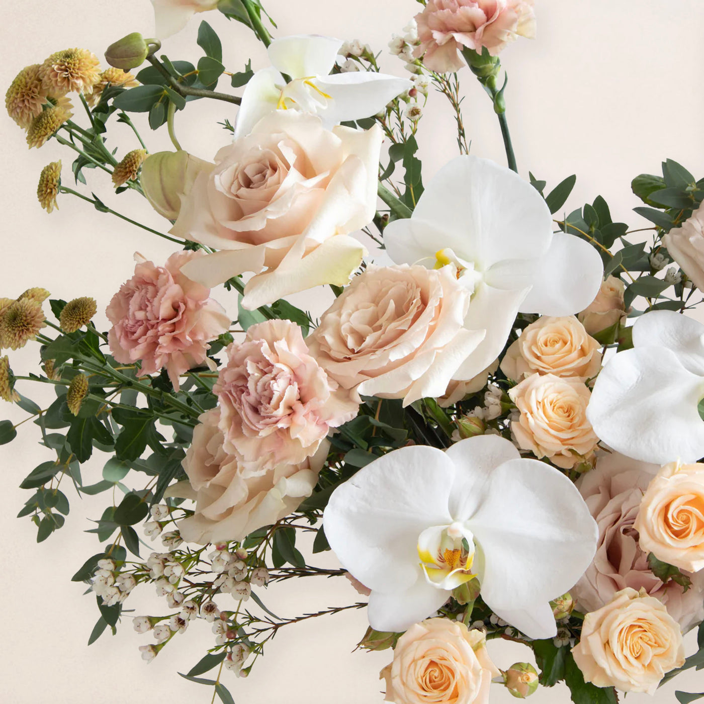 The Palawan is a luxurious arrangement that blends soft blush roses, elegant orchids, and delicate greenery, creating a serene and romantic color story. Perfect for special occasions, it’s crafted with care to create a lasting and memorable experience.