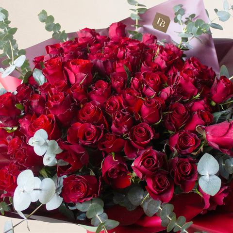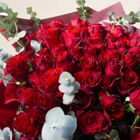 Colour Story: Red Focal flowers: Roses Filler flowers: Eucalyptus